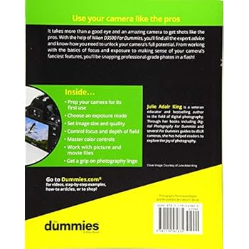 From the Back Cover Take photos in automatic, scene, or manual modes Find tips on controlling focus, depth of field, and color Capture better action shots, portraits, and close-ups Use your camera like the pros It takes more than a good eye and an amazing camera to get shots like the pros. With the help of Nikon D3500 For Dummies, you'll find all the expert advice and know-how you need to unlock your camera's full potential. From working with the basics of focus and exposure to making sense of your camera's fanciest features, you'll be snapping professional-grade photos in a flash! Inside... Prep your camera for its first use Choose an exposure mode Set image size and quality Control focus and depth of field Master color controls Work with picture and movie files Get a grip on photography lingo Read more About the Author Julie Adair King is a veteran educator and bestselling author in the field of digital photography. Through her books including Digital Photography For Dummies and several For Dummies guides to dSLR cameras, she has helped readers to explore the joy of photography. Read more