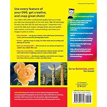From the Back Cover Use every feature of your D90, get creative, and snap great shots! Your Nikon D90 offers professional-quality features to helpyou take your photography to the next level. Take full advantageof every one with this fun and easy guide! Understand and use all the dials and modes, manage photo size and quality, take creative control with manual settings, and share your images in print or online. Nuts and bolts — set up your camera, work with lenses and memory cards, and use automatic photography modes Go live — get the scoop on using Live View mode and recording and playing HD movies Gain new shooting skills — find out how to use advanced options to capture any subject like a pro Exposure is everything — control aperture, shutter speed, and ISO; work with Active D-Lighting; and use various flash modes Out of the camera — download, organize, and archive your images and share them in prints, e-mails, and slide shows Open the book and find: Tips for taking perfect portraits, dynamic action shots, and beautiful nature pics Techniques for manipulating color and focus Detailed coverage of every menu option Advice on which Custom Settings to use (and which ones to avoid) How to choose the right Image Quality setting Help with using Retouch menu options to fix problem photos Easy-to-understand explanations of technical lingo Read more About the Author Julie Adair King is the author of many digital photography books, including Digital Photography For Dummies, Nikon D40/D40x For Dummies, and Nikon D60 For Dummies. She also teaches digital photography workshops at such locations as the Palm Beach Photographic Centre. Read more